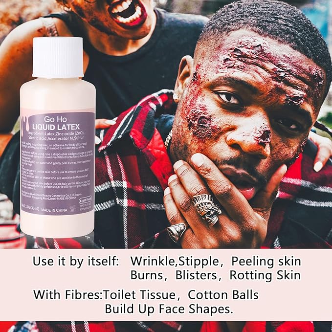 - 【Liquid Latex for Halloween Monster Zombie】Creating Scars and gashes,cuts,bullet holes,big wounds,bites,burns,blisters,fast lips,broken nose,bumps,torn face,zombie makeup or any creatures you want.Note:for the latex,better to shave the area you will apply or put some body lotion on,or it may ripping out your body hair when remove.It has a rather potent smell.Perform a spot test on the skin before use to ensure you are NOT ALLERGIC to latex.
