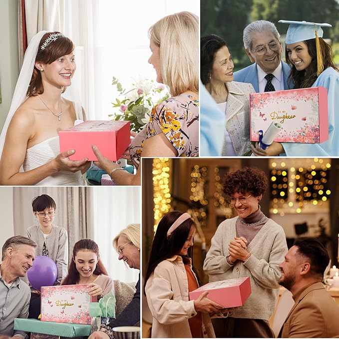 - ๐A GIFT BOX SPECIALLY FOR DAUGHTER โ This beautiful pink gift box for women is specially made for giving to daughters, granddaughters and daughter in law, etc. the lovely pink gift box is printed with gold gilding letters saying To My Daughter, and the contents in the gift basket are also carefully selected and combined to delight your daughterโs heart, and bring her a joyful day.