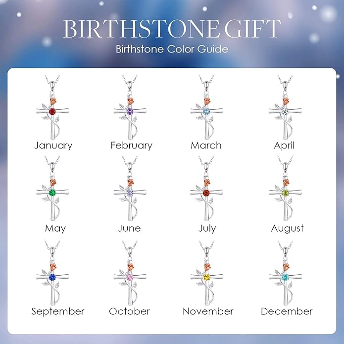 Cross Necklace for Women, 925 Sterling Silver Birthstone Necklace for Women with Rose Flower Birthstone Womens Jewelry Birthday Gifts for Wife Women