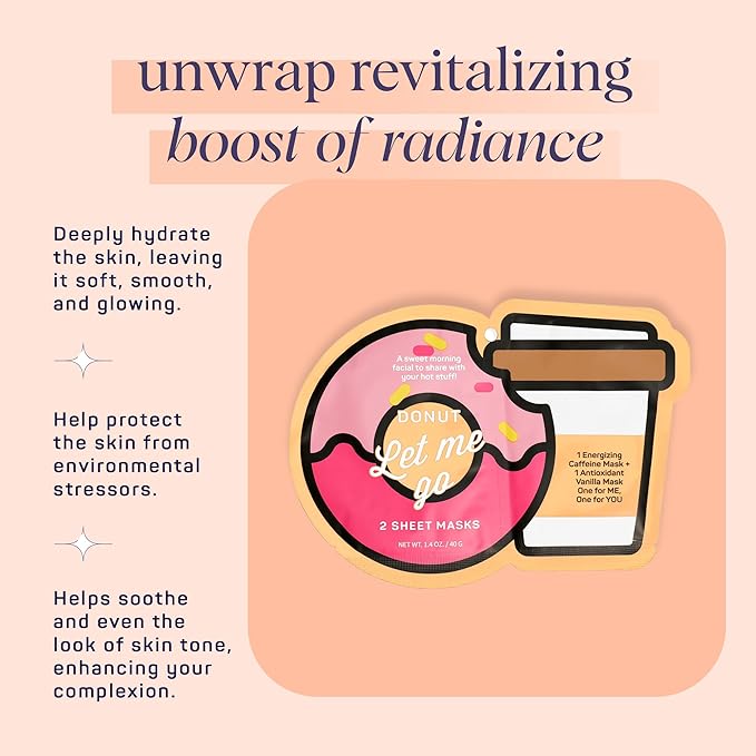 SpaLife Donut Let Me Go Duo Facial Masks - Pack of 6 - Skincare Gift Set for Valentine's Day - Radiant Caffeine and Soothing Vanilla - Beauty Moisture Hydration Face Mask for Men and Women