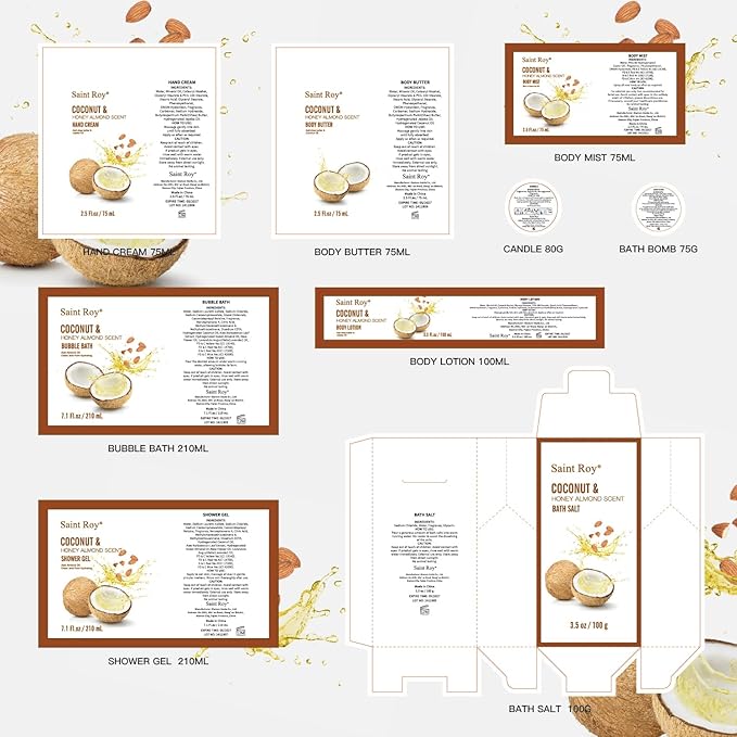- 【 Sweety and Pleasant Coconut Honey Almond Scent Spa Gift Basket】sweet almond bath gift set, Bridal Shower Bath Kit with Home Bath Pampering Package basket. The basket with handle can also be reused in many different ways, Its upscale and beautiful basket makes a multi-purpose storage solution to keep your beauty essentials. It also creates a unique decoration for your bathroom, vanity table, powder area, and more.