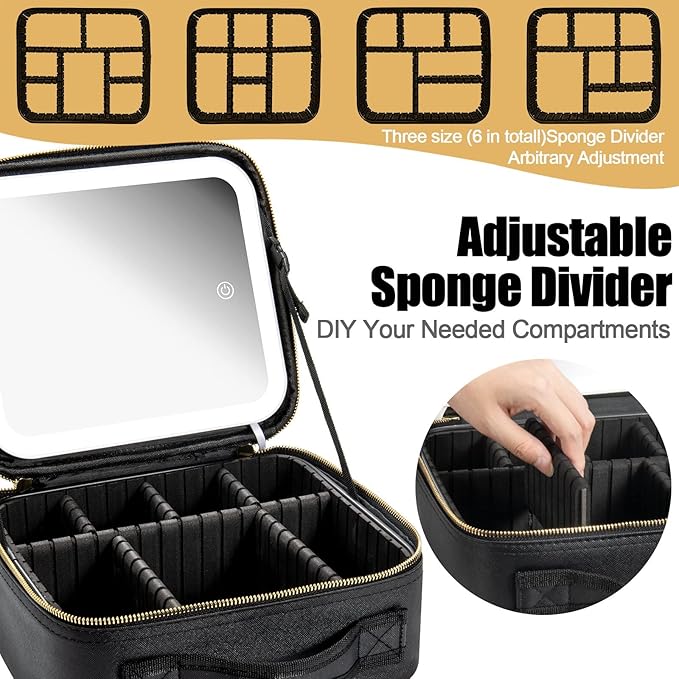 Seoneiro Makeup Travel Bag with LED Lighted Mirror Adjustable Brightness Portable Waterproof Makeup Case with Adjustable Dividers, Make up Train Case Organizer Makeup Brush Accessories and Tool Case