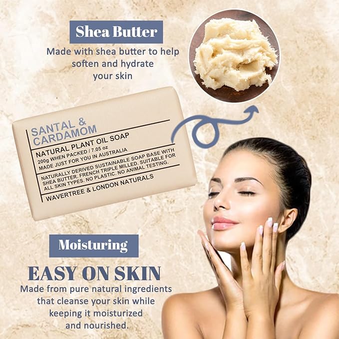 Wavertree & London Santal & Cardamon Scented Natural Soap Bars (2 Bars), 7oz Moisturizing French Triple Milled Soap enriched with shea butter - Plant Oil Bath & Body Soap Bars [100% Naturally derived]