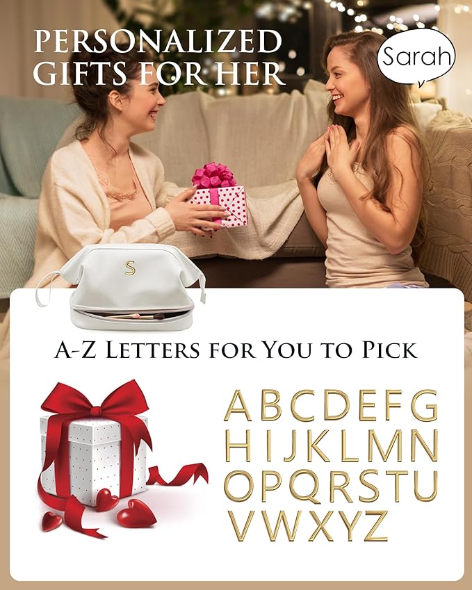 Women Gifts, Initial Makeup Bag, Personalized Double Layer Cosmetic Bag with Makeup Brush Organizer, Waterproof, Large Capacity PU Leather Travel Toiletry Bag, Gift for Wife