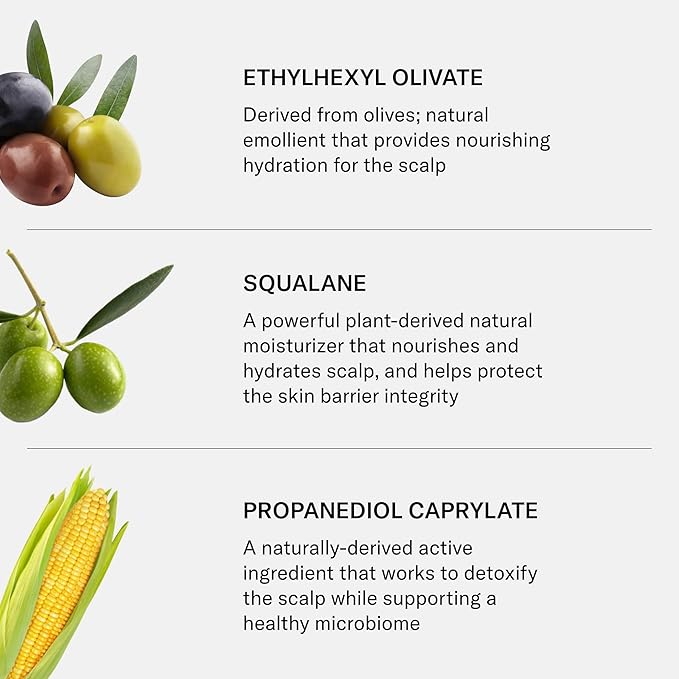 - Hero Ingredients: Ethylhexyl Olivate: Derived from olives; natural emollient that provides nourishing hydration for the scalp. Squalane: A powerful plant-derived natural moisturizer that nourishes and hydrates scalp, and helps protect the skin barrier integrity. Propanediol Caprylate: A naturally-derived active ingredient that works to detoxify the scalp while supporting a healthy microbiome. Sarcosine: Helps to rebalance the microbiome and fights against stress, pollution, and product buildup