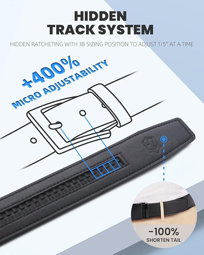 - EASY TO USE BELT FOR MEN-Just slide the dress belt into the sliding buckle and pull leather belt through,the ratchet buckle auto-locks.To release the ratchet belts,gently push the release lever on the side of the automatic buckle and lock will snap. Simple,smooth and sleek