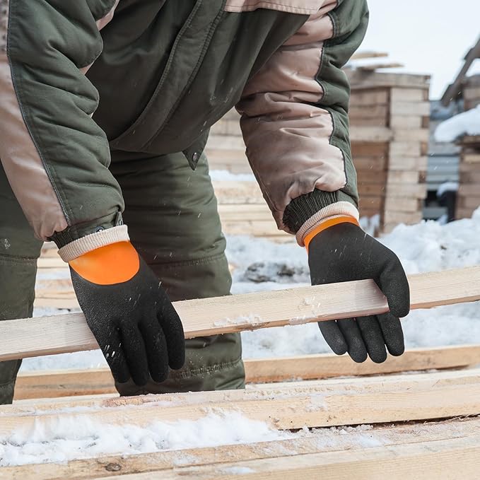 - 【WARM WORK GLOVES WITH GRIP】: These winter work gloves have a black latex coating, thick enough to provide safety protection and thin engough to allow good dexterity when work with tools. Water proof work gloves maintains excellent grip in dry, wet and light oily conditions. offer you extra ability to hold objects firmly, like damp, wet and icy material.Cold weather work gloves are great dexterity for warehouse package workers and truck drivers too.