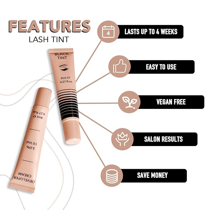 - ALL-IN-ONE COLOR KIT: The kit includes 1 black color 8ml, 1 developer cream 8ml, 1 reusable eyepatches, 2 micro brushes, 1 gloves, 1 spoon and 1 brush for mixing