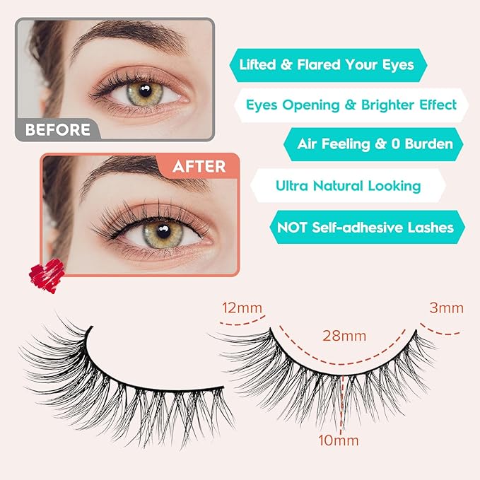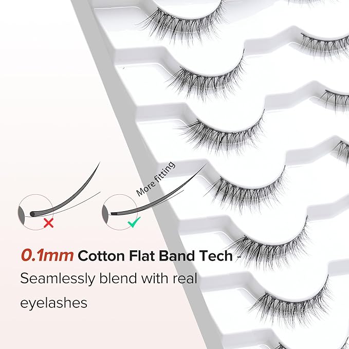 - THIN BAND FALSE EYELASHES: The wispy eyelashes use 0.1mm thin cotton flat band tech, seamlessly blend to your real eye lashes for a natural exquisite make up look, suit for DAY-TO-DAY use, party and so on