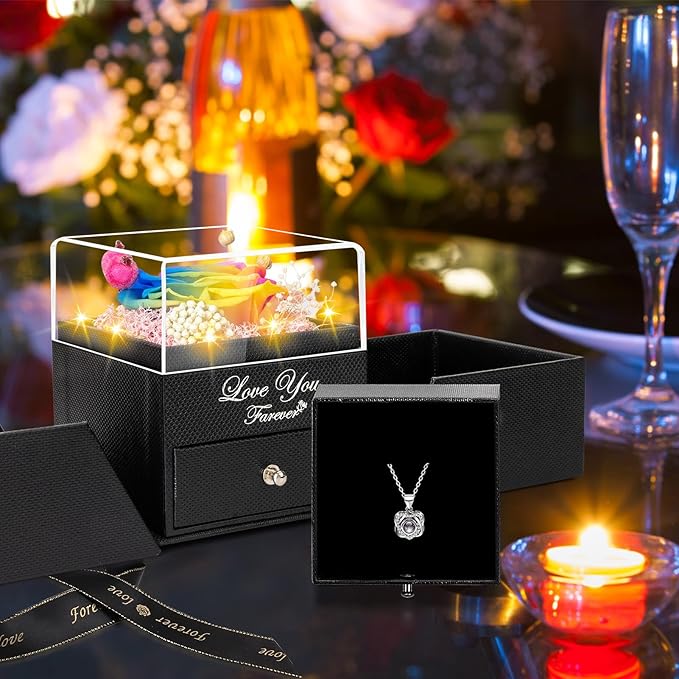 - 🎁【Im Sorry Gifts for Her Package】Mother's Day Gift Ideas Preserved Roses are well wrapped in the gift box,so that you could give directly without spend time on package. As an exquisite luxury gift,it can also store other jewelry. The necklace can be worn, and the rose box can be placed indoors as an ornament,Your lover will feel happy every day looking at it. 1 Preserved Eternal Rose + 1 Gift Box + 1 Double Heart Necklace(With I Love You Necklace in 100 Languages)+ 1 Gift Bag + 1 Greeting Card.