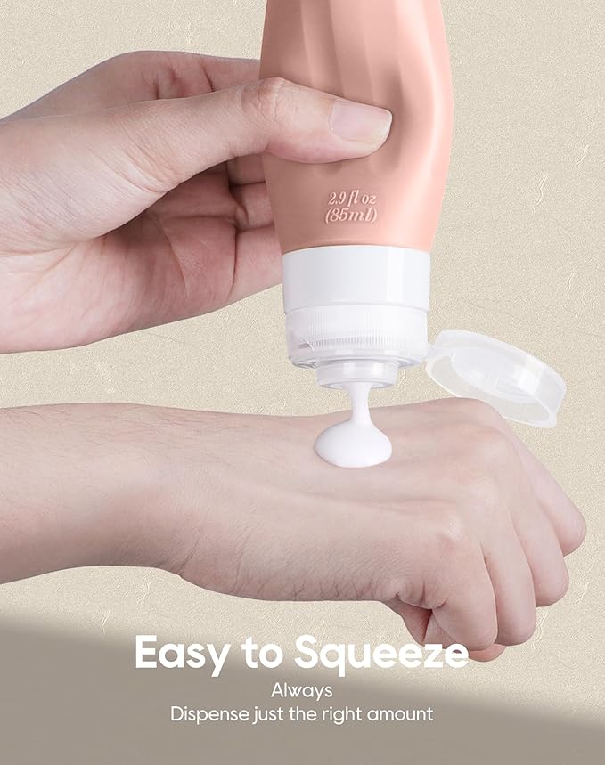 - 【SILICONE & SQUEEZABLE】Made of food grade Silicone which is BPA free and non-toxic, feel soft, flexible and comfortable instead of hard like traditional plastic travel bottles. The silicone is thick and durable but can be squeezed easily