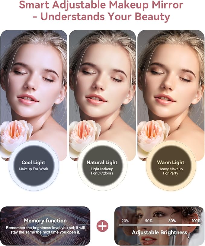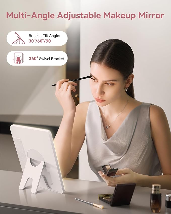 - 💡【SMART THREE-COLOR FILL LIGHT MIRROR】Smart fill light mirror with light intensity memory function, usable independently. Mirror stand adjusts 360° & 30°, 60°, 90°. Touch switch adjusts cool, natural, warm light, revealing true skin and facial details. Confidently face any makeup scenario. Long press for brightness control, unaffected by environment. 2000mAh battery removes battery worries.
