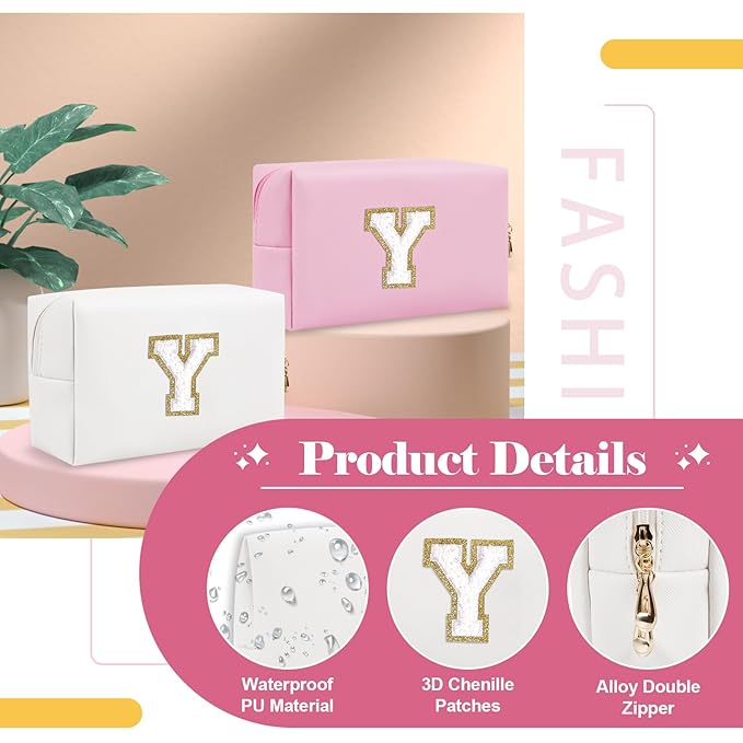 Small Personalized Initial A-Z Preppy Patch Makeup Bag,White PU Chenille Letter Travel Cosmetic Pouch with Zipper,Cute Toiletry Bag,Gift Ideal for Teen Girls Women Teacher Bridesmaid,Letter Y