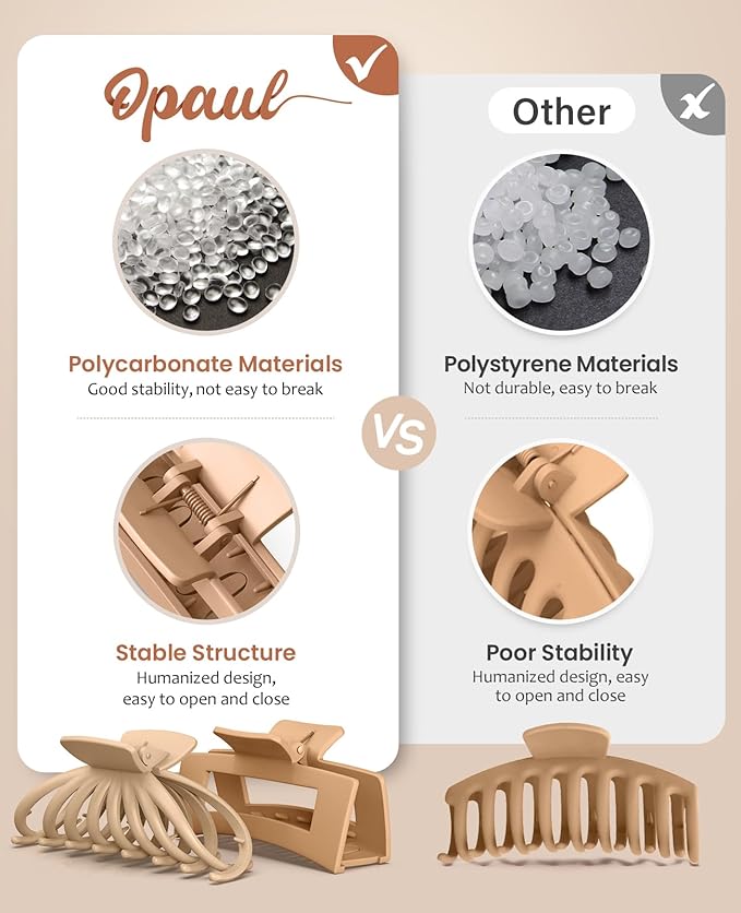 - 【OPAUL Exclusive Design】We continuously test and refine the latest claw clip shapes to ensure the perfect amount of amplitude, delivering a strong grip. Our large hair clips are designed for convenience, allowing effortless wearing and removal without any discomfort. They are suitable for all hair types and thicknesses.