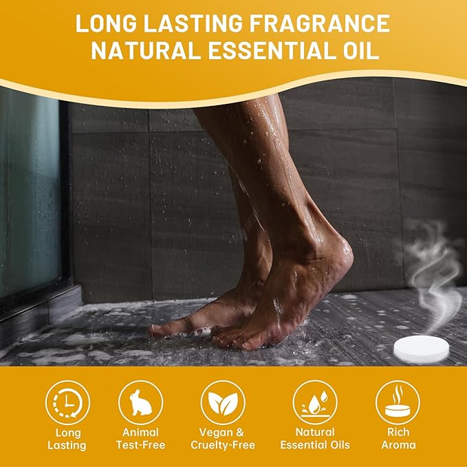 - [SHOWER STEAMERS LASTS ] We use small batches of steam distillation to concentrate natural essential oils, higher density, all-natural formula, so that the aroma of shower steamers lasts longer than similar products. Natural and pleasant aroma, the pure natural essential oils of shower steamers aromatherapy release the fragrance of organic plants and fruits to relax the mind.