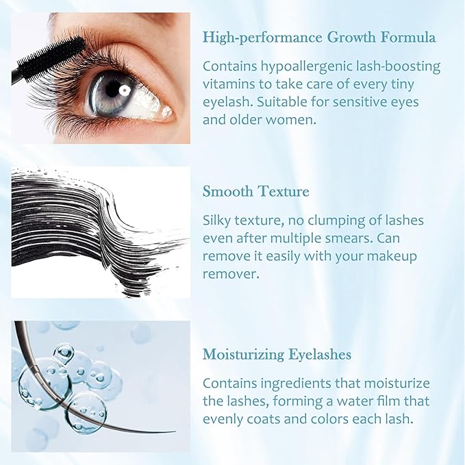 - HYPOALLERGENIC FOR SENSITIVE EYES - The natural fiber dense mascara has hypoallergenic ingredients, including Brazilian Plam Wax, Vitamin E and other plant Ingredient which allow lashes to grow over time and more caring for the delicate skin around the eyes.