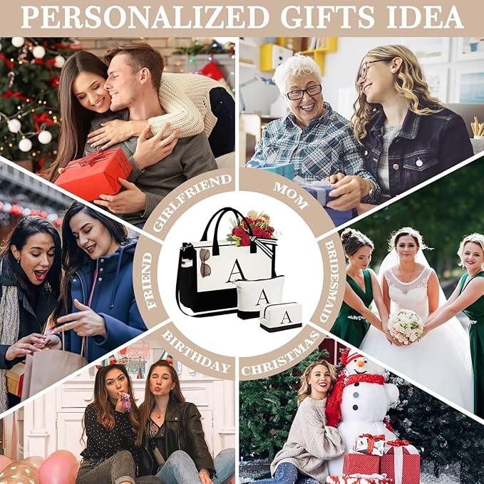YOOLIFE Initial Canvas Tote Bag & Makeup Bag, Birthday Gifts for Women Mom Sister Friends, Bridesmaid Wedding Gifts