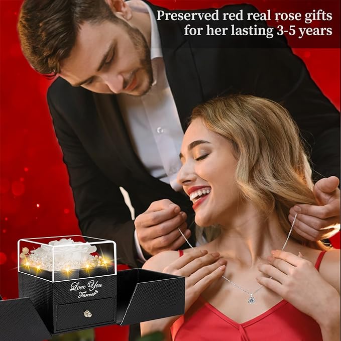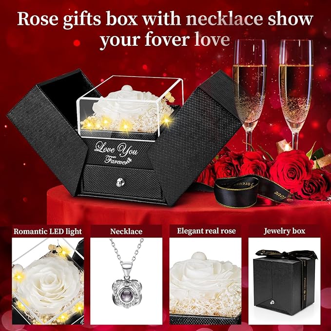 - 🎁【Im Sorry Gifts for Her Package】Mother's Day Gift Ideas Preserved Roses are well wrapped in the gift box,so that you could give directly without spend time on package. As an exquisite luxury gift,it can also store other jewelry. The necklace can be worn, and the rose box can be placed indoors as an ornament,Your lover will feel happy every day looking at it. 1 Preserved Eternal Rose + 1 Gift Box + 1 Double Heart Necklace(With I Love You Necklace in 100 Languages)+ 1 Gift Bag + 1 Greeting Card.
