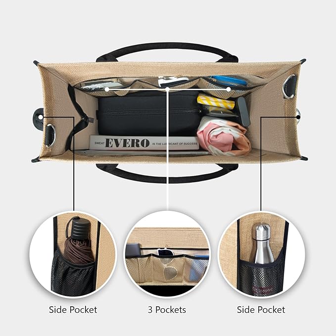 - ELABORATED CRAFT: Made of heavy duty singed (reduce fluff) natural jute, the tear strength is increased by 30%, which makes it stand up without tipping. All seams are reinforced by double thread sewing, 7 stitches per inch for the durability. It features zip-top closure for security. A removable thickened PE pad at bottom helps keep the bag in structured shape and won't sag even when it's loaded with many items.