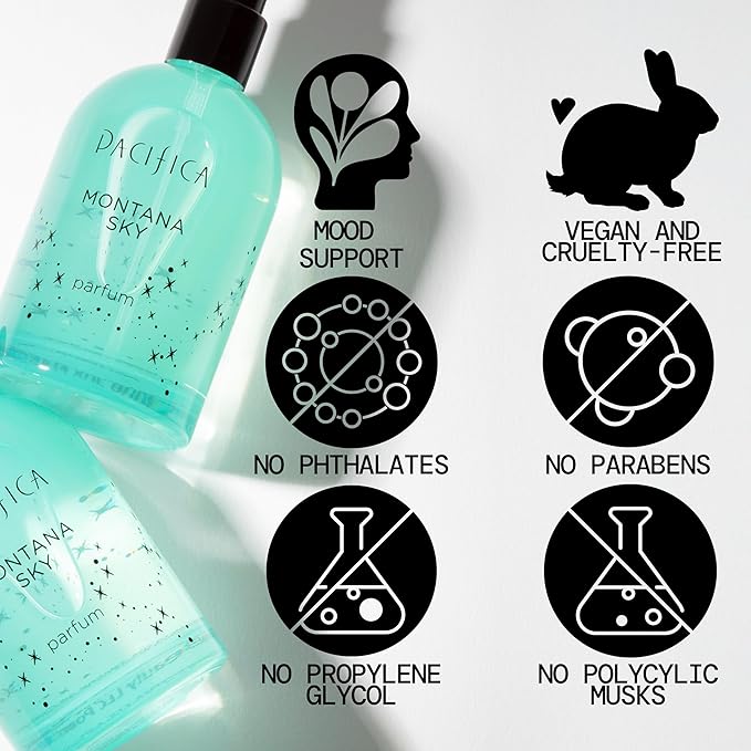 - VEGAN & CRUELTY-FREE ETHICAL BEAUTY – Feel good knowing this fragrance aligns with your values. Pacifica’s perfumes are 100% vegan and cruelty-free (never tested on animals), underscoring our commitment to clean beauty. Made in the USA with sustainably sourced ingredients, Montana Sky comes in a recyclable glass bottle with an easy-to-remove spray pump. It’s eco-conscious from formula to packaging – a perfect choice for the mindful, modern perfume lover.