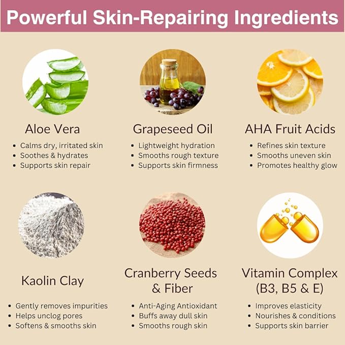 - Dual Exfoliation Face Mask – Cranberry fiber and seeds provide gentle physical exfoliation, while a fruit-based AHA complex (glycolic, lactic, citric, malic, and tartaric acids) delivers chemical exfoliation. Together, they smooth texture, unclog pores, and refresh skin’s surface.