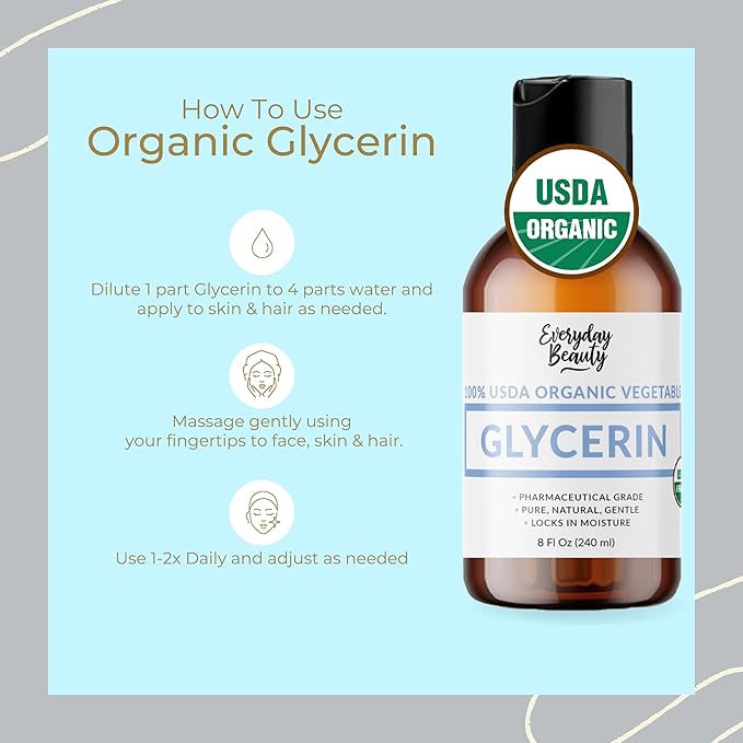 Everyday Beauty 100% Organic Glycerin - USDA Certified - Perfect for DIY Beauty Products, Crafts, and Formulations - Derived From Coconut - Skin and Hair Moisturizer for Deep Hydration - 8 Fl Oz