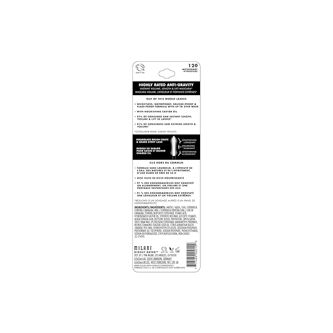 - BENEFITS: Instant volume, length & lift Enhanced with conditioning Castor Oil & plant and fruit-bases waxes Transfer, sweat and smudge-proof formula helps lock in curl* Consumer Claims: *96% of consumer saw instant length, volume & lift in lashes *90% of consumers saw extreme length & volume *96% of consumers felt the mascara was comfortable to wear & weightless all day *93% of consumers felt lashes were lifted all day *Results observed in a consumer panel survey