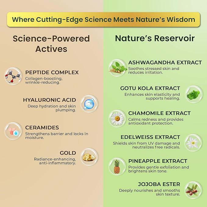 - Natural Radiance Enhancers: Gold Bhasma illuminates the complexion while Edelweiss extract provides superior antioxidant protection. Gotu Kola revitalizes skin by promoting healthy circulation for a natural, radiant glow.