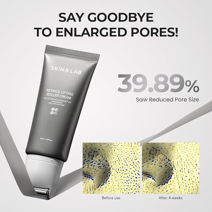 - Low Irritation Face, Neck, and Décolleté Lifting Cream: SKIN&LAB Retinol Lifting Roller Cream infused with Retinol, Hyaluronic Acid, and Peptides to reduce fine lines and lift sagging skin. The nano-liposome formula stabilizes Retinol, making it more easily absorbed by the skin without irritation.