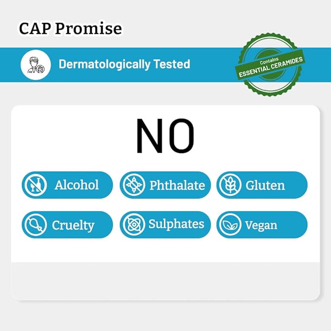 - CAP Promise : Vegan, Cruelty-Free, Phthalate Free, Sulphate-free, Alcohol-Free, Gluten-Free, Triclosan-Free
