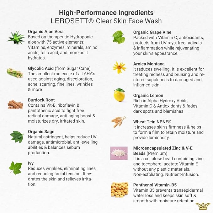 - 🌱 For All Skin Types, Used by Professionals – Formulated for sensitive, irritated, oily, normal, and acne-prone skin. Gentle yet effective for all ages, men and women. Apply a dime-sized amount to damp skin twice daily for optimal results. Also removes makeup and works well with any LEROSETT acne system or kit.—No parabens, alcohol, petroleum or other harsh ingredients.