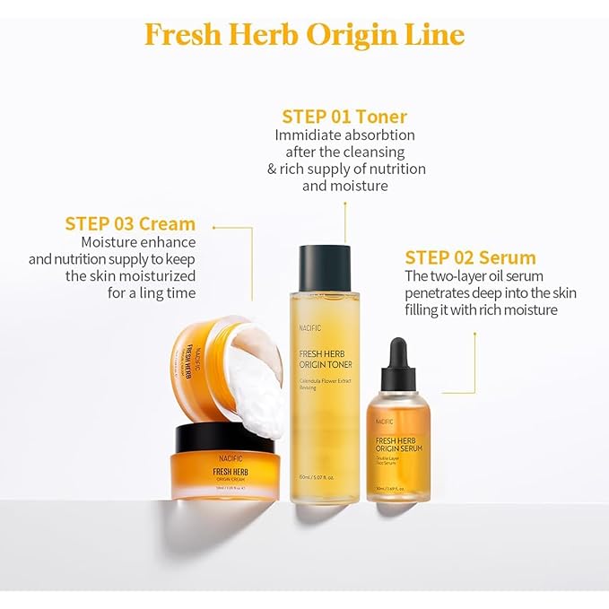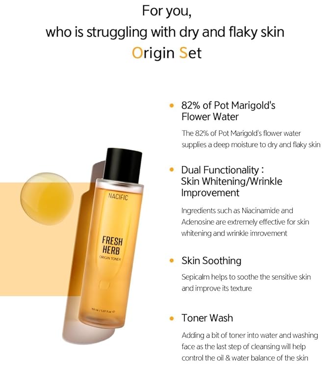 - Calendula Infused Toner: Enjoy our Fresh Herb Origin Toner 150ml, enriched with Calendula Flower Water brewed through a tincture method. This dual-functional toner brightens and addresses wrinkles, removing impurities. Suitable for all skin types, including sensitive and irritated skin
