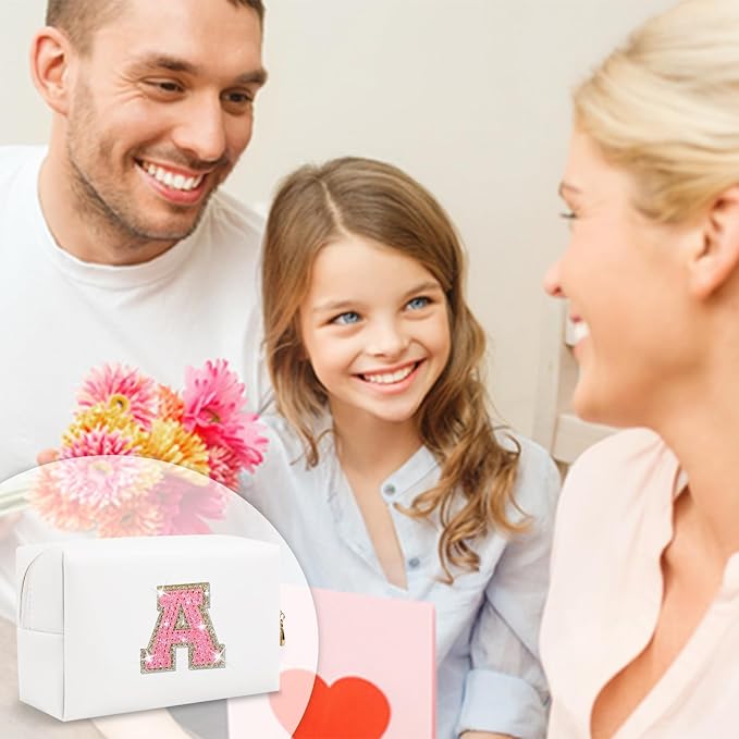 Small Initial Patch Makeup Bag Personalized Gifts Make Up Bag,White Cute PU Leather Glitter Letter Cosmetic Bag with Zipper,Trendy Portable Travel Toiletry Pouch,Preppy Stuff for Teen Girls Women A