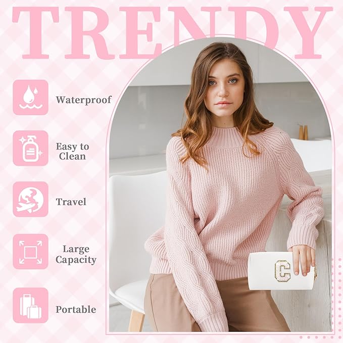 - ๐ใ Unique Design ใPreppy patch cosmetic bag with golden glittering sequins patch, fashionable and skin-friendly, comfortable to the touch. The cute A-Z letter pattern patch has a strong personalized style, which is sewn on this cosmetic bag, making the storage bag more eye-catching and adding a personalized atmosphere.