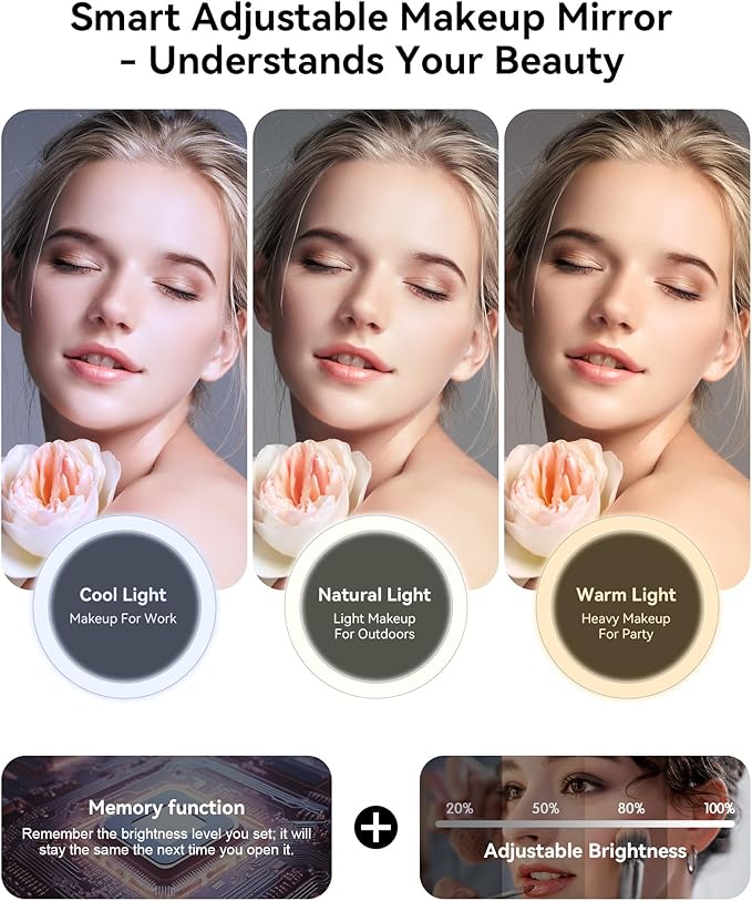 - 💡【SMART THREE-COLOR FILL LIGHT MIRROR】Smart fill light mirror with light intensity memory function, usable independently. Mirror stand adjusts 360° & 30°, 60°, 90°. Touch switch adjusts cool, natural, warm light, revealing true skin and facial details. Confidently face any makeup scenario. Long press for brightness control, unaffected by environment. 2000mAh battery removes battery worries.