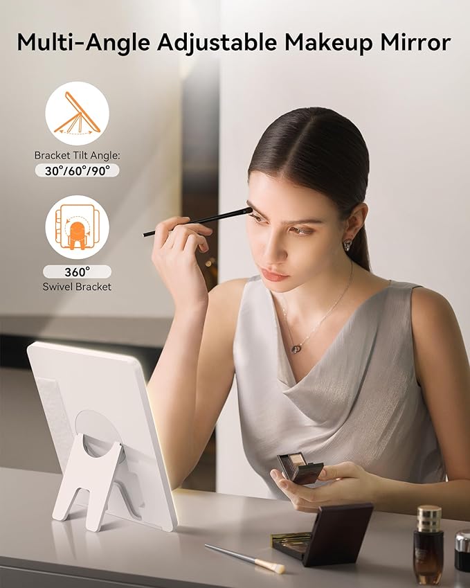 - 💡【SMART THREE-COLOR FILL LIGHT MIRROR】Smart fill light mirror with light intensity memory function, usable independently. Mirror stand adjusts 360° & 30°, 60°, 90°. Touch switch adjusts cool, natural, warm light, revealing true skin and facial details. Confidently face any makeup scenario. Long press for brightness control, unaffected by environment. 2000mAh battery removes battery worries.