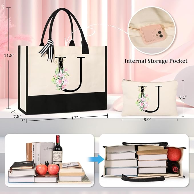 AYGE Personalized Initial Canvas Beach Tote, Monogrammed Gifts for Women, Makeup Bag, Birthday Gifts for Sister, Mom, Teacher, Bridesmaid