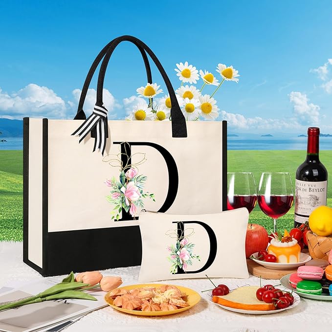 AYGE Personalized Initial Canvas Beach Tote, Monogrammed Gifts for Women, Makeup Bag, Birthday Gifts for Sister, Mom, Teacher, Bridesmaid (D)