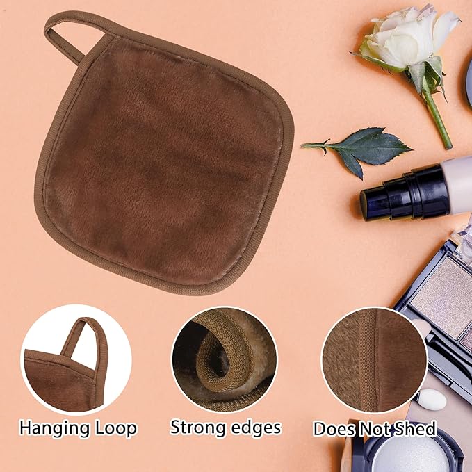 Makeup Remover Cloth, 6" x 6" Make Up Towels Reusable Face Cloth for Washing Face, Makeup Remover Pads Microfiber Face Washcloth with Mesh Bag, Just Water, 12 Pack, Brown