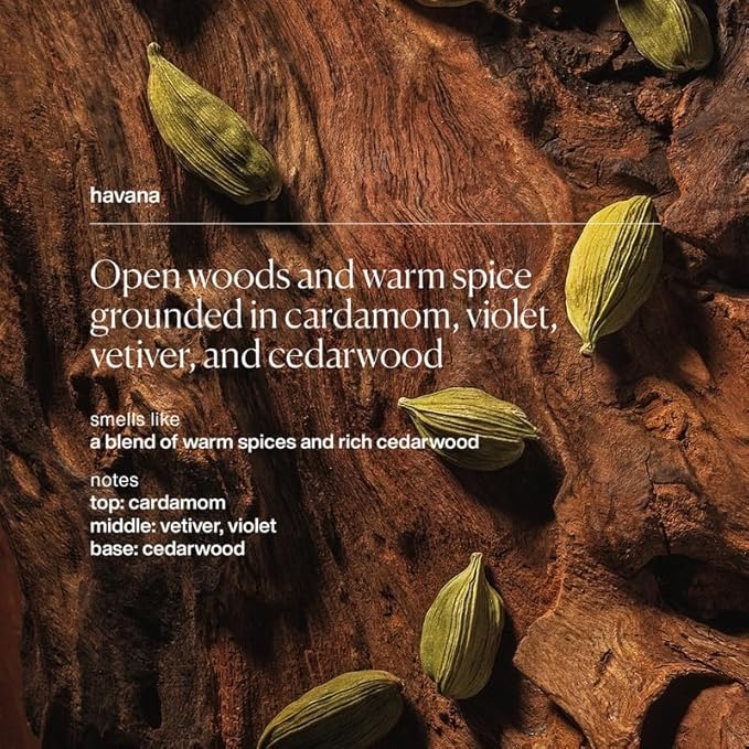 - CARDAMOM, VETIVER & CEDARWOOD FRAGRANCE: Enjoy the warm scent of Havana, a blend of open woods and warm spice grounded in cardamom, violet, vetiver, and cedarwood with our heat activated fragrance.