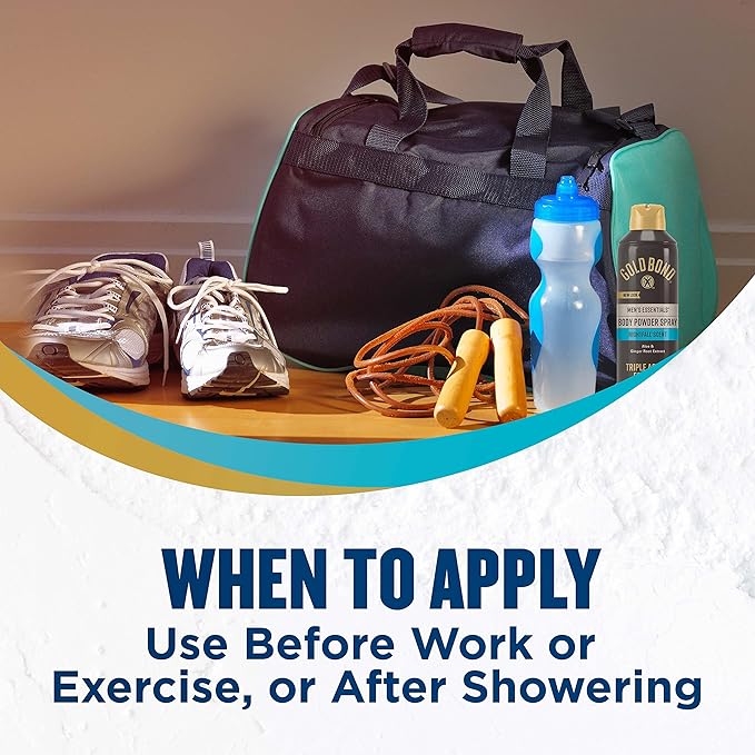- Contains: One (1) 7-oz. spray bottle of Gold Bond Men's Essentials Body Powder Spray, Recharge Scent