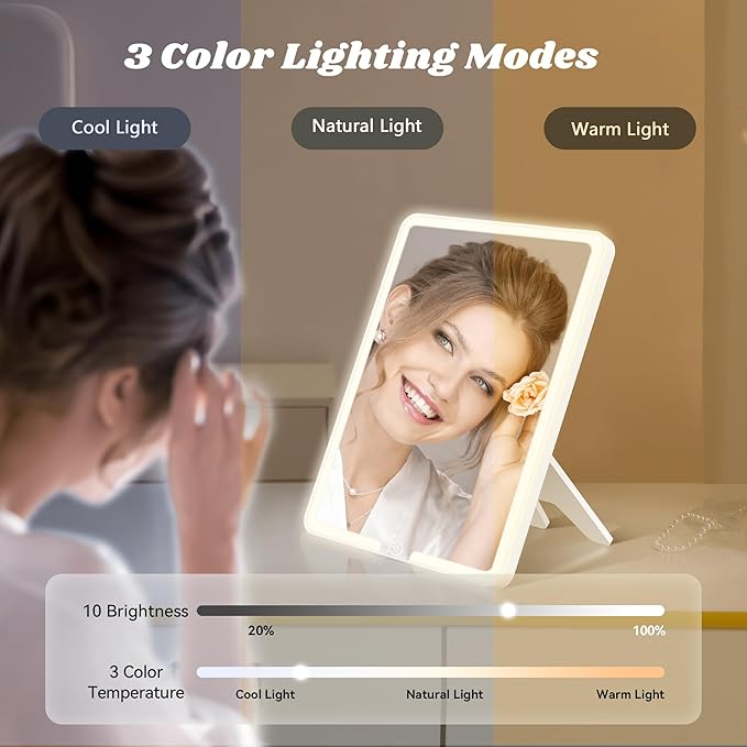 - 💡【SMART THREE-COLOR FILL LIGHT MIRROR】Smart fill light mirror with light intensity memory function, usable independently. Mirror stand adjusts 360° & 30°, 60°, 90°. Touch switch adjusts cool, natural, warm light, revealing true skin and facial details. Confidently face any makeup scenario. Long press for brightness control, unaffected by environment. 2000mAh battery removes battery worries.