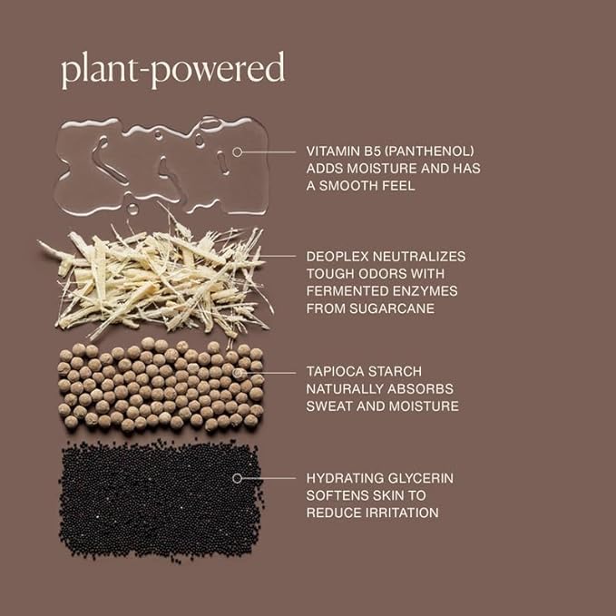- PLANT-POWERED SWEAT ABSORPTION: Advanced enzymes and tapioca starch effectively absorb sweat without causing build-up, ensuring all-day freshness. Pro-vitamin B5 and glycerin work synergistically to neutralize tough odors, providing long-lasting odor protection.