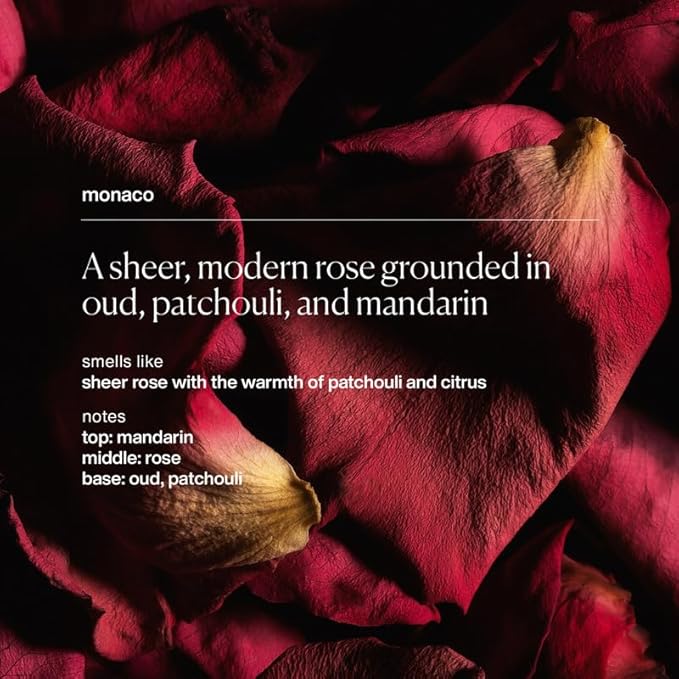- ROSE, MANDARIN, OUD & PATCHOULI FRAGRANCE: Enjoy the alluring scent of Monaco, a blend of sheer, modern rose grounded in oud, patchouli, and mandarin with our heat activated fragrance.