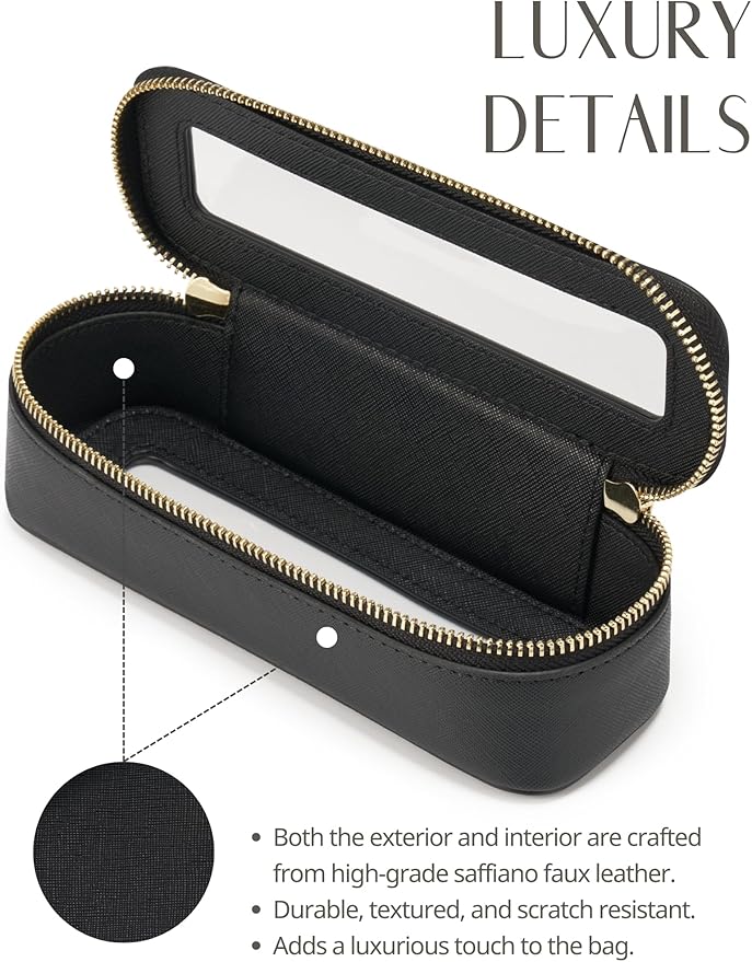- [Premium Quality] - This clear small cosmetic case is crafted from high-grade saffiano faux leather, making it highly scratch-resistant, durable, and easy to clean. It features a smooth zipper for secure closure and elegant light gold metal accents for a luxurious touch.