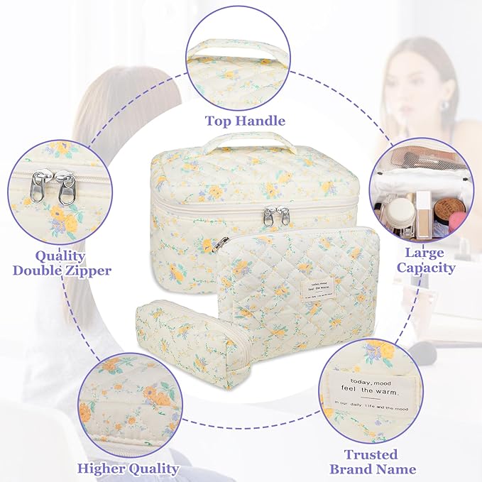Quilted Makeup Bag Set, Large Floral Cosmetic Bag for Women, Cute Cotton Makeup Bag, Flower Travel Toiletry Organizer Bag (Yellow Daylily)
