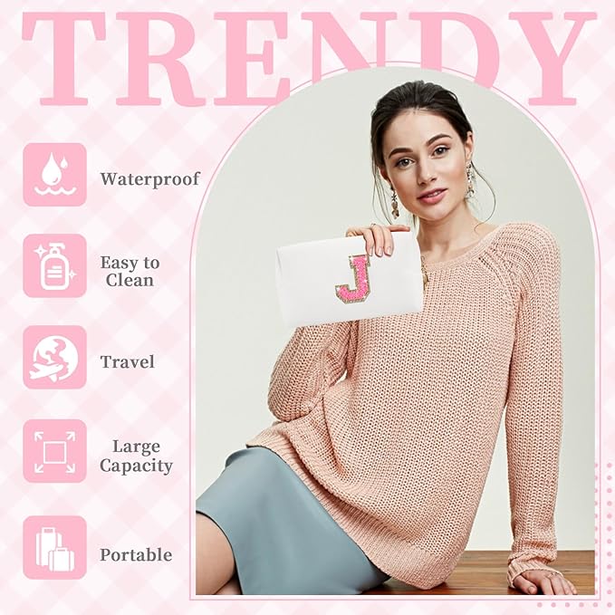 - ๐ถใ Unique Design ใPreppy cosmetic bag with golden glittering chenille patch, fashionable and skin-friendly, comfortable to the touch. The cute letter pattern patch has a strong personalized style, which is sewn on this cosmetic bag, making the storage bag more eye-catching and adding a personalized atmosphere.