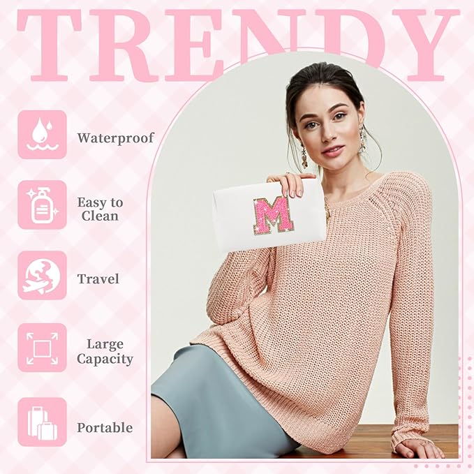 - ๐ถใ Unique Design ใPreppy cosmetic bag with golden glittering chenille patch, fashionable and skin-friendly, comfortable to the touch. The cute letter pattern patch has a strong personalized style, which is sewn on this cosmetic bag, making the storage bag more eye-catching and adding a personalized atmosphere.