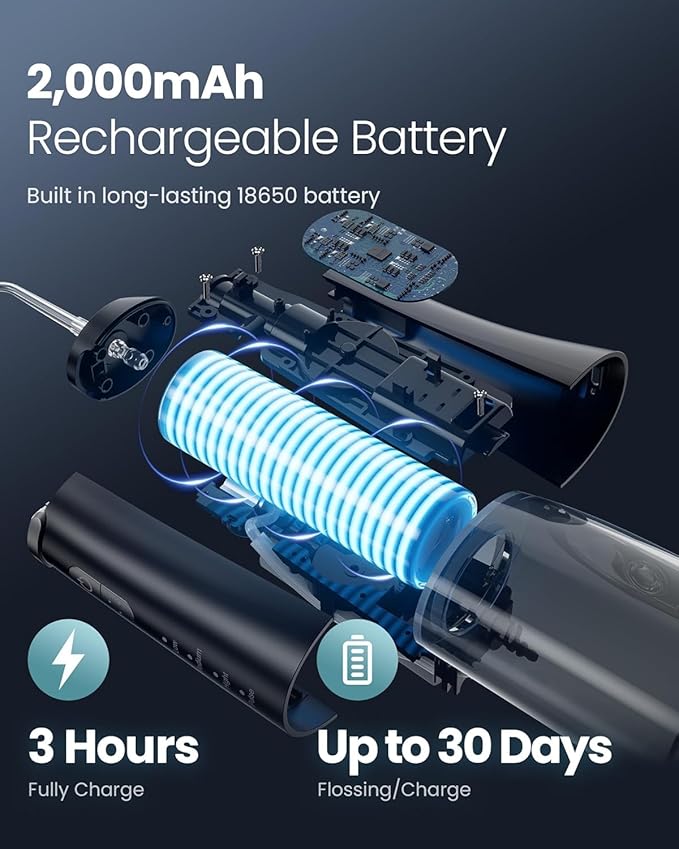 - Long-Lasting Battery, Portable Anywhere: Enjoy up to 30 days of use on a 3-hour charge with this compact, lightweight water dental flosser. Ideal for home or travel. Comes with a USB cable (adapter not included) for convenient charging on the go