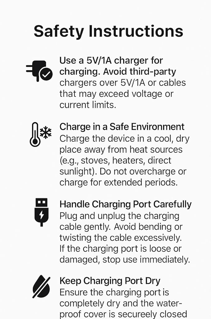 - Safety Instructions: Use only a 5V/1A charger for safe charging. Avoid third-party chargers that exceed voltage or current limits. Charge in a cool, dry place away from heat sources and do not overcharge. Plug and unplug the charging cable gently, and ensure the charging port is completely dry with the waterproof cover securely closed before charging.